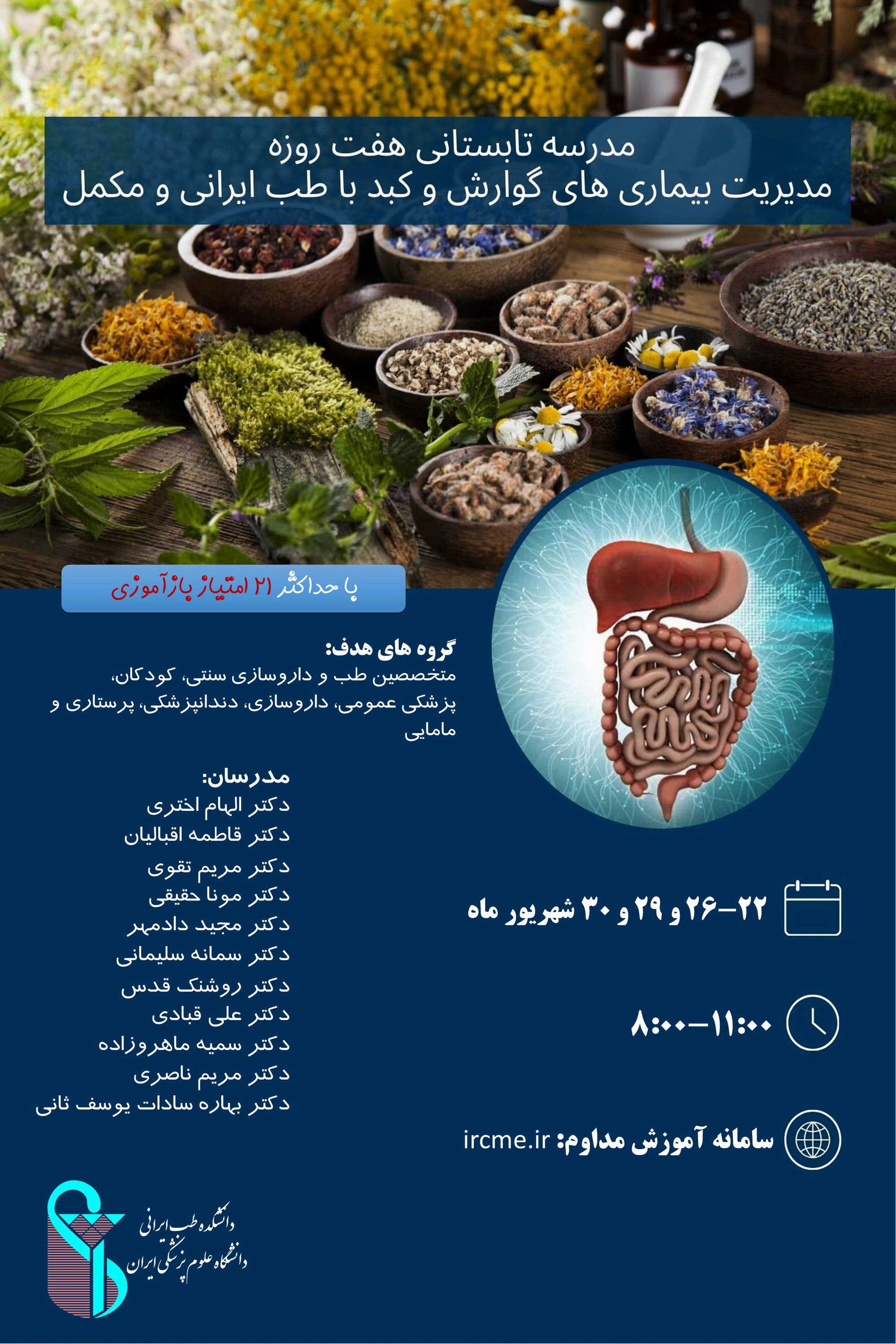 دانشکده طب ایرانی دانشگاه علوم پزشکی ایران برگزار می کند: مدرسه تابستانی هفت روزه مدیریت بیماریهای گوارش و کبد با طب ایرانی و مکمل